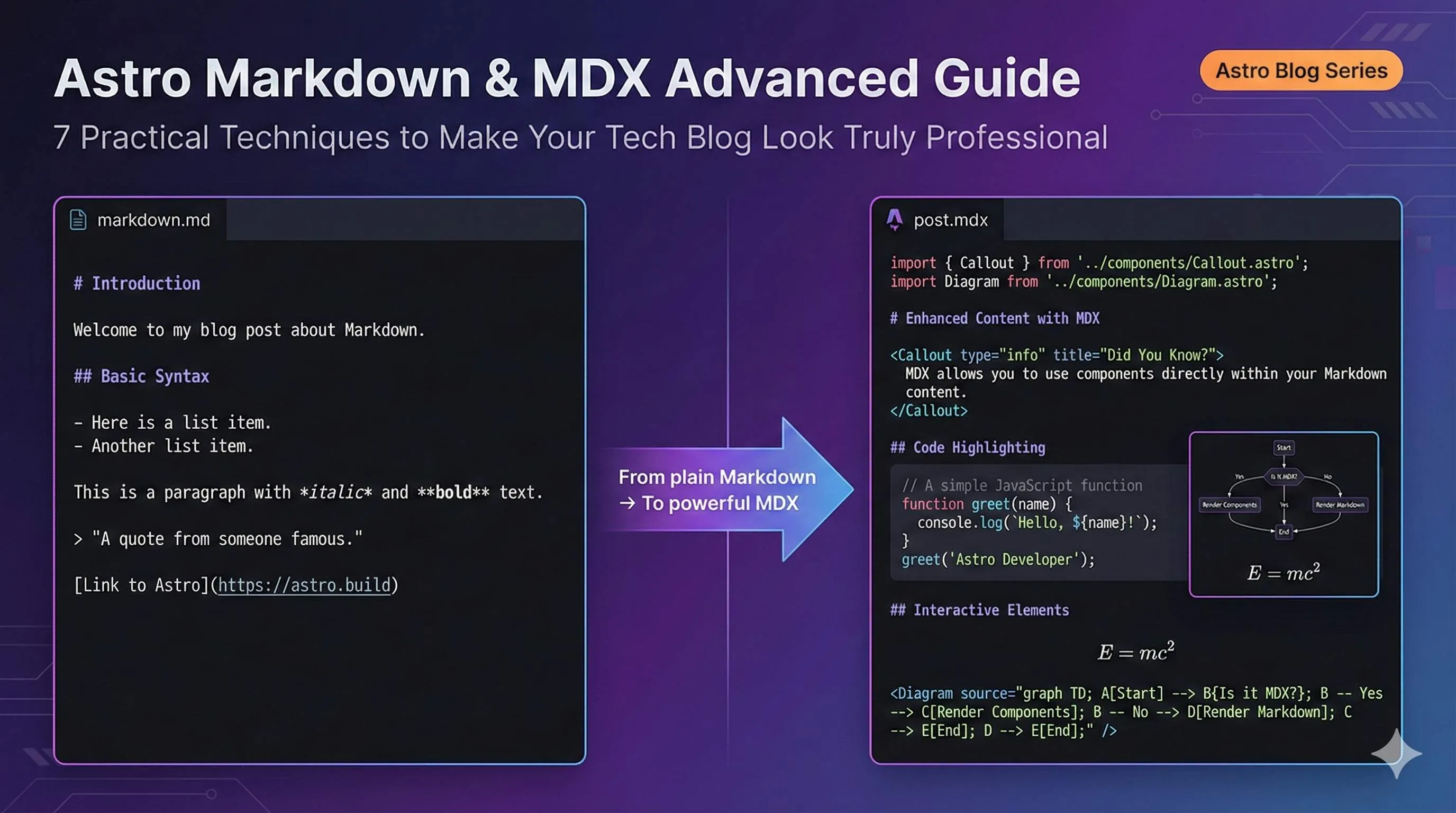 这篇文章我会分享 7 个 Astro Markdown/MDX 的进阶用法,从最基础的环境配置到代码高亮、自定义组件、数学公式、流程图,每个技巧都配了完整的代码和配置步骤。读完这篇,你的技术博客能从”能看”升级到”专业”。